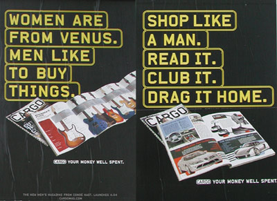 “Vitals” grew out of a “Details” insert and will become a standalone publication in September 2004. “Cargo,” which launches in April 2004, has begun an ad campaign that consist, in part, of outdoor boards and posters that get to the heart of the shopping man: Men just want their shit without all the other crap that goes into shopping.